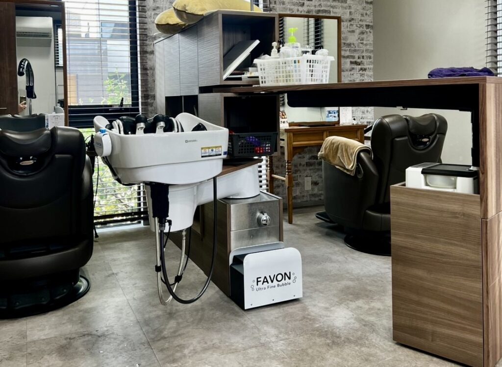 FAVONは、美容室のシャンプー台に接続して使用する業務用ウルトラファインバブル発生装置です。